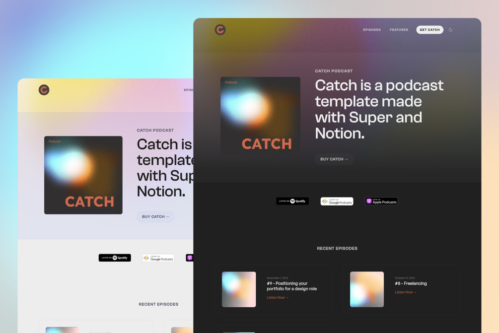 Catch is a podcast template made with Super and Notion, built to help you quickly build a podcast brand website and connect it to third-party podcasting platforms. Launch your podcast website today, and give your audience a place to get to know you.